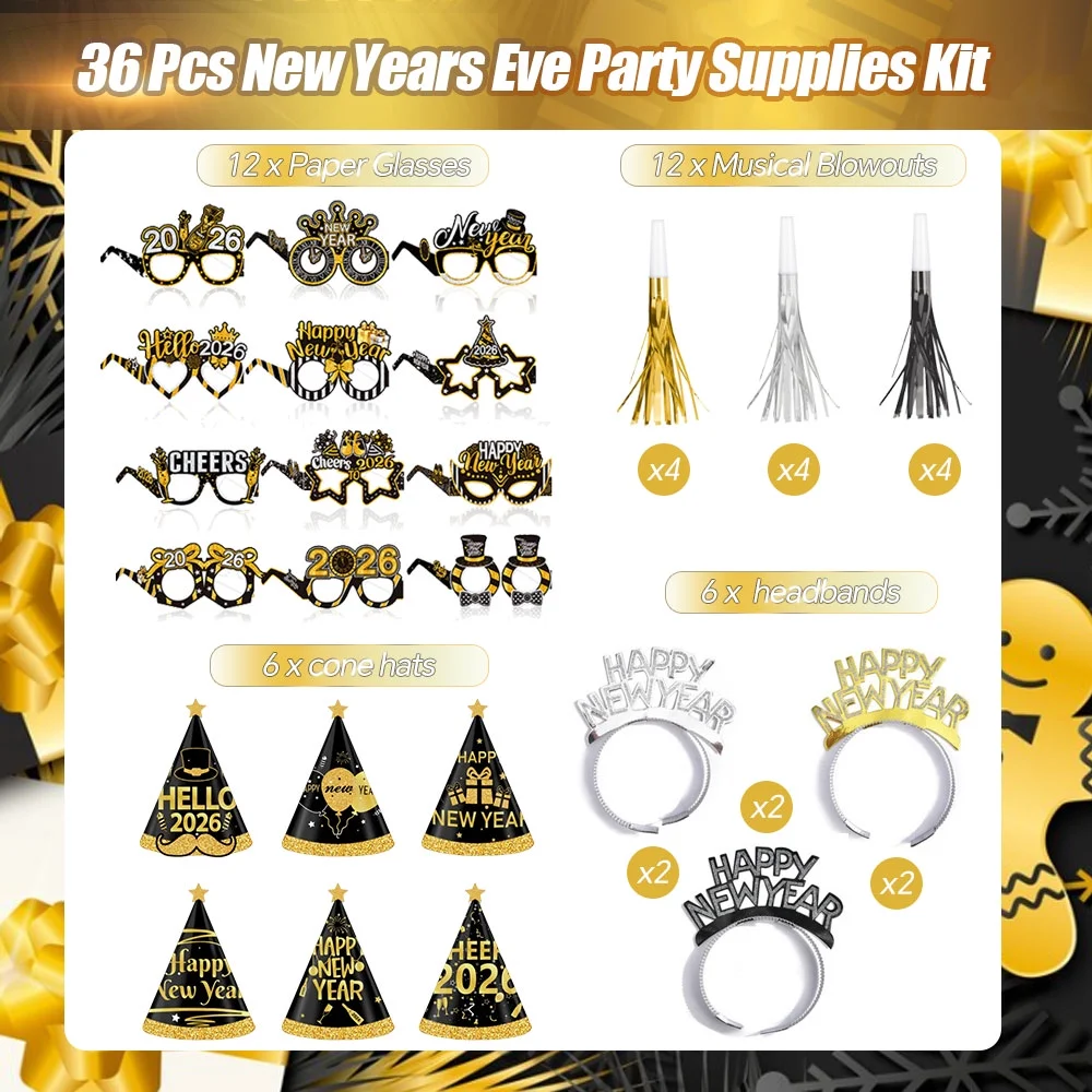 2026 New Year Party Supplies: :This set includes 6 headbands (2 each in gold, silver, and black), 6 cone hats, 12 creative paper glasses, and 12 fun squawkers —a total of 36 pieces. Whether for family New Year gatherings, friend parties, or company events, everyone can enjoy their own festive decorations.